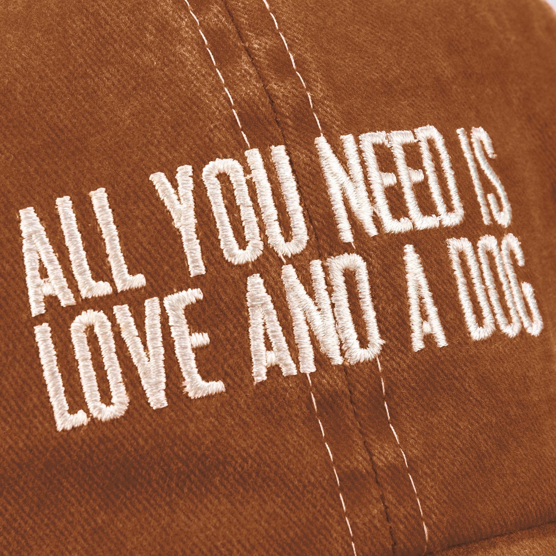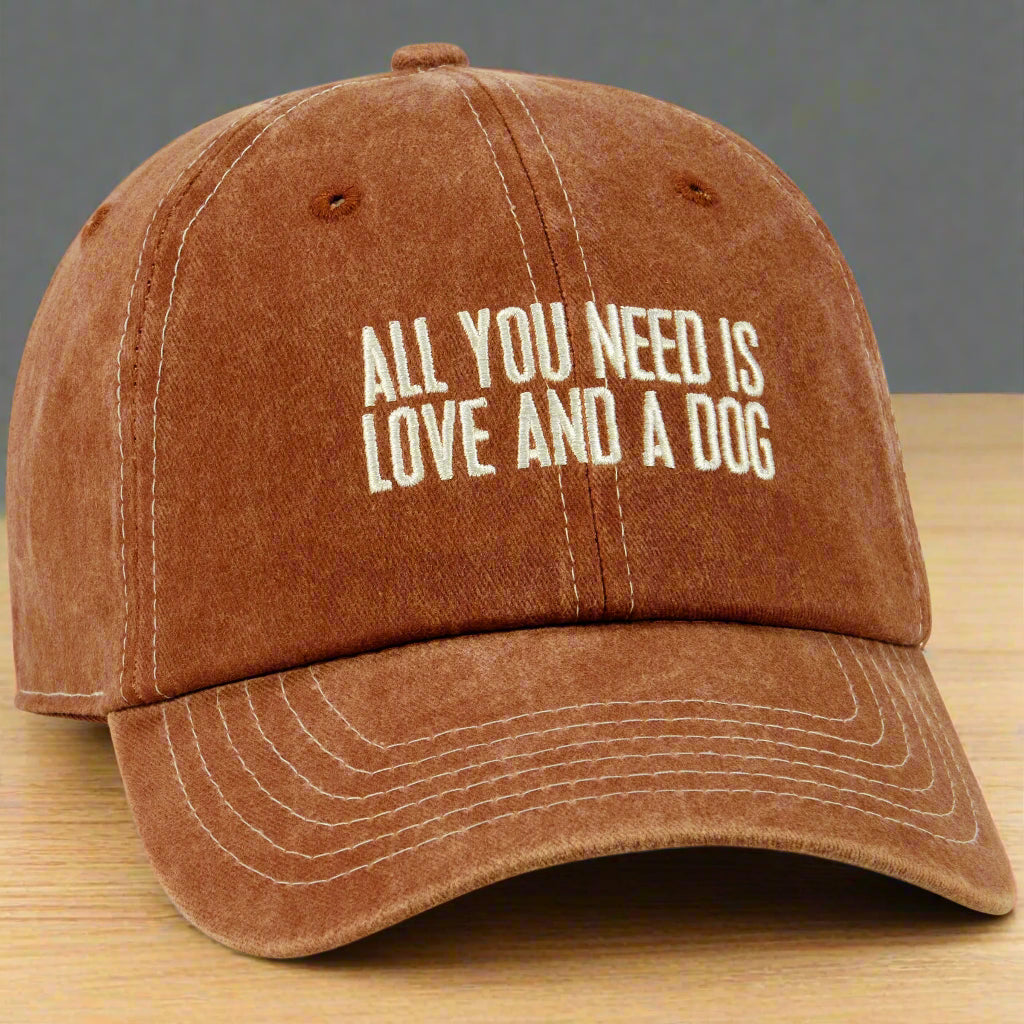 Show off your dog-loving style with our Love And A Dog Baseball Cap! Made from 100% cotton, this comfy hat comes in a warm burnt orange color that looks good on everyone (yes, even cat people… but don’t tell the dogs). The front features an embroidered sentiment that says it all: “All You Need Is Love And A Dog.” Because honestly, isn’t that the truth?