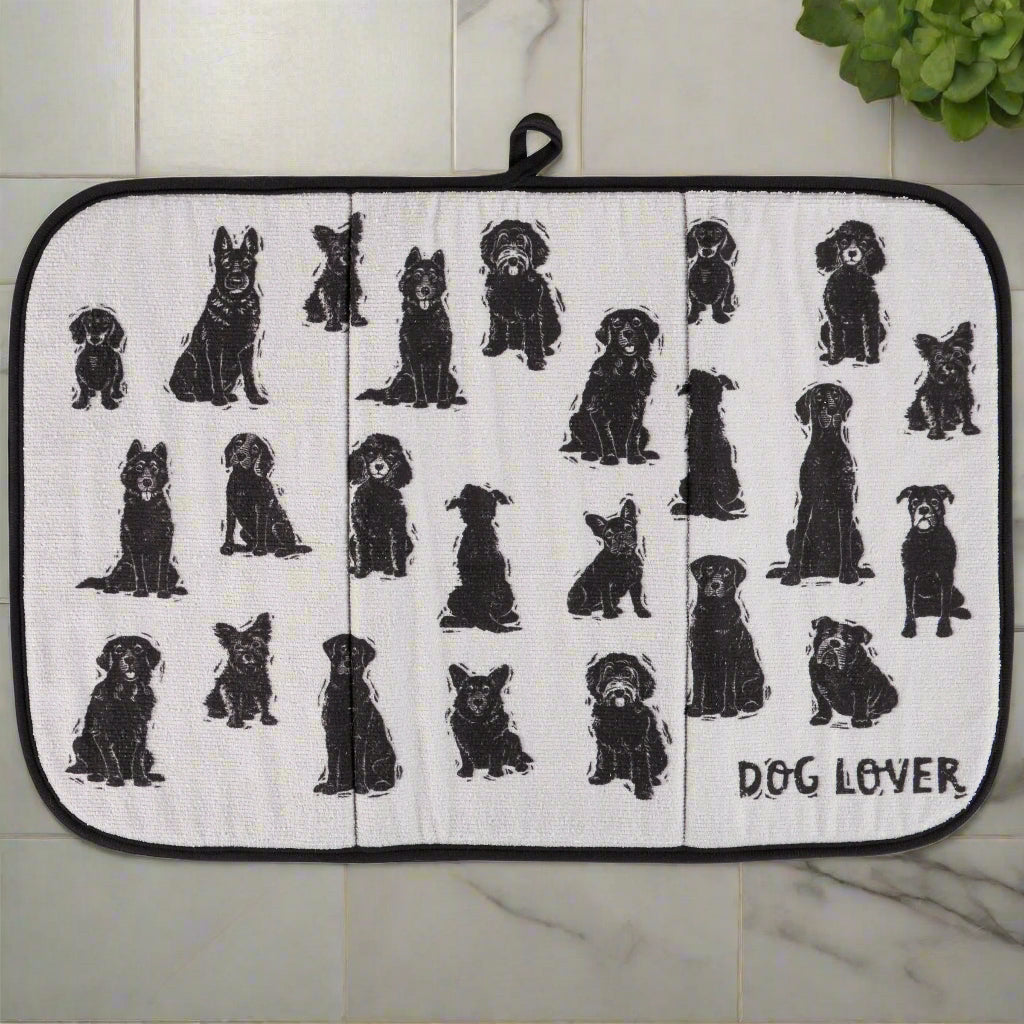 Add a touch of doggy charm to your kitchen with our Dog Lover Drying Mat! This ultra-absorbent mat features a fun dog pattern with a dog-themed sentiment reading “Dog Lover.” The design is based on original block print artwork, showcasing your love for pups in full color on a 21" x 14" space, making it perfect for drying dishes, cups, or even your dog’s water bowl.