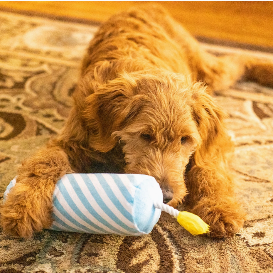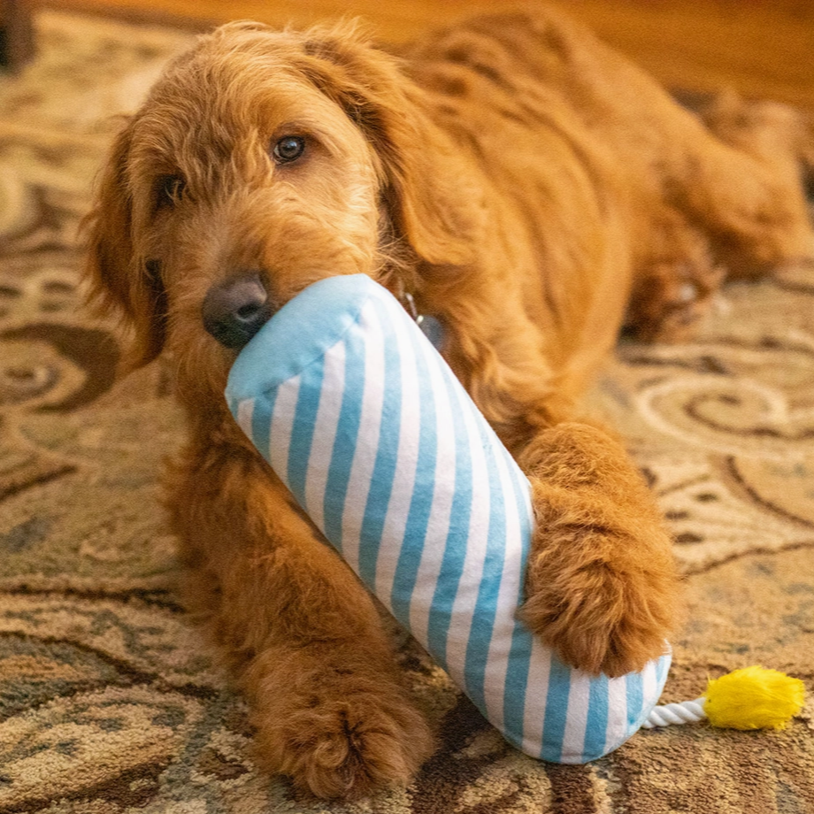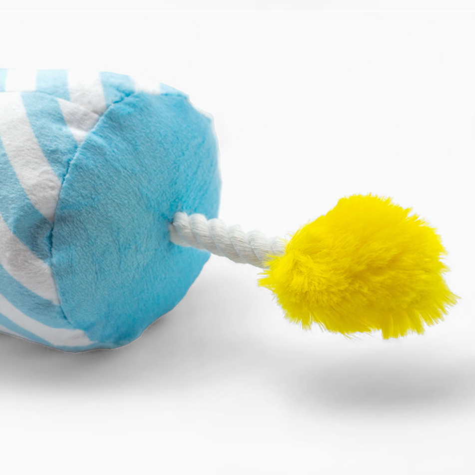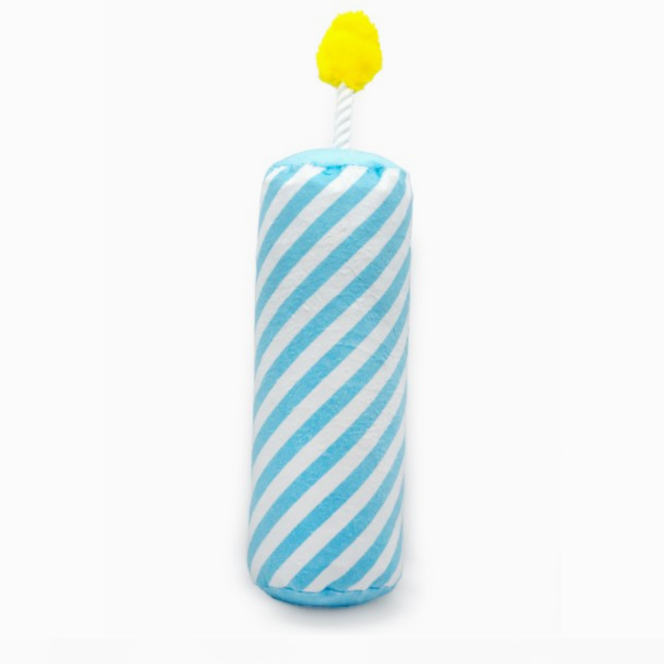 Celebrate your dog’s big day with the Birthday Candle Dog Toy! This plush, 16-inch blue and white birthday candle is designed to add a festive touch to your pup's paw-ty. With its fun candle rope at the end, your dog can enjoy hours of squeaky, crinkly fun that will keep them entertained all day long.